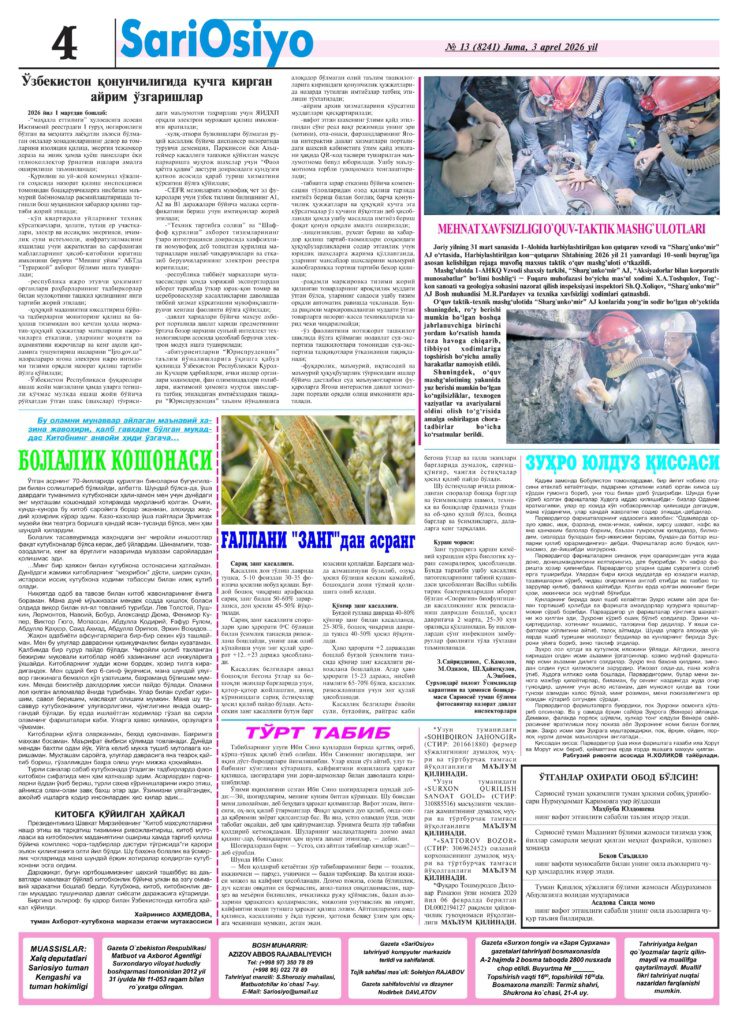 • Surxondaryo viloyati, Sariosiyo tumani, Sharofobod MFY Minor ko`chasi, 35 uy